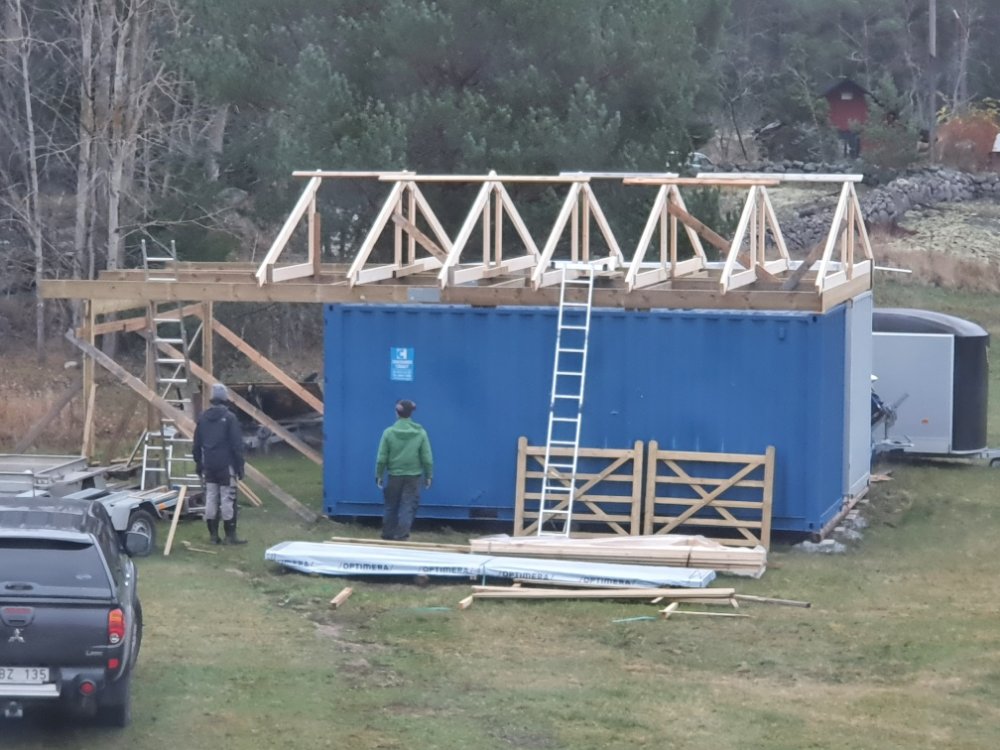 R har fått hjälp med takstolarna, då det är litet mycket nu.. Tanken är att taket ska på innan ev snö kommer, för att skydda container’na från att börja rosta av kvarliggande vatten…
