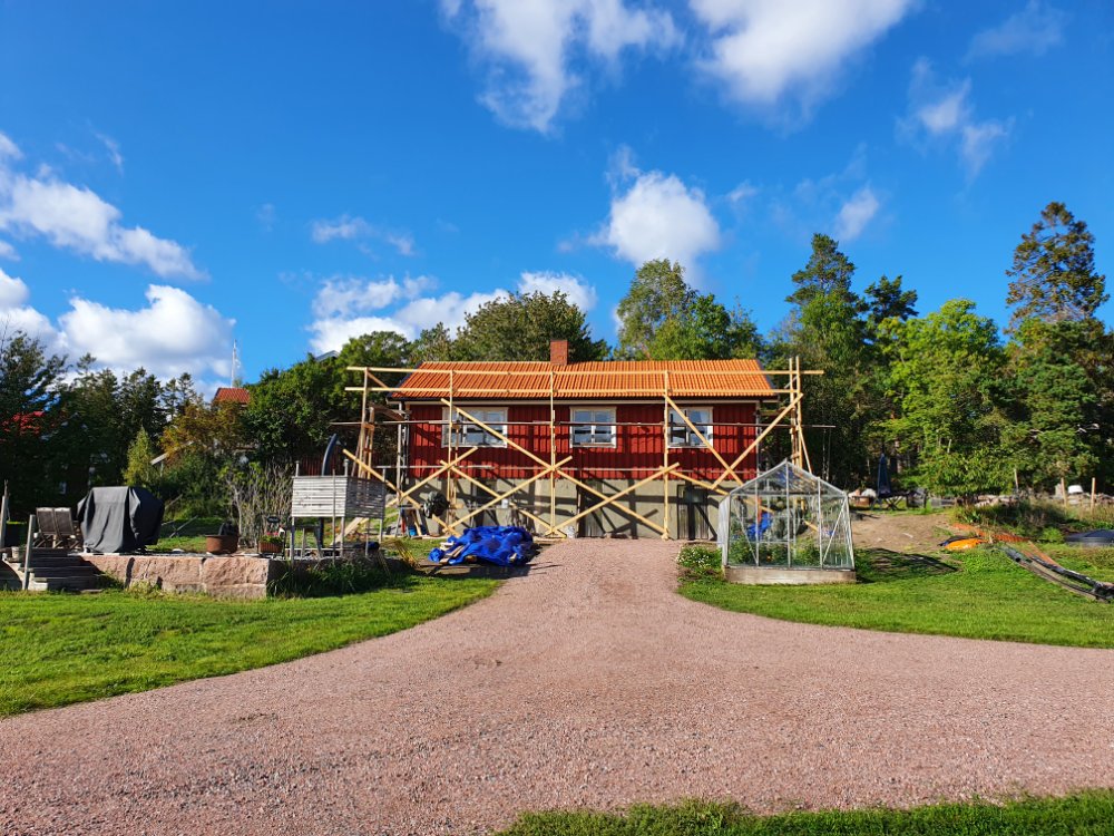 …men säkert kommer takteglet på plats. Baksidan blir nog klar imorron, och på onsdag kommer plåtis och fixar skorstenen o däromkring. 🤗
