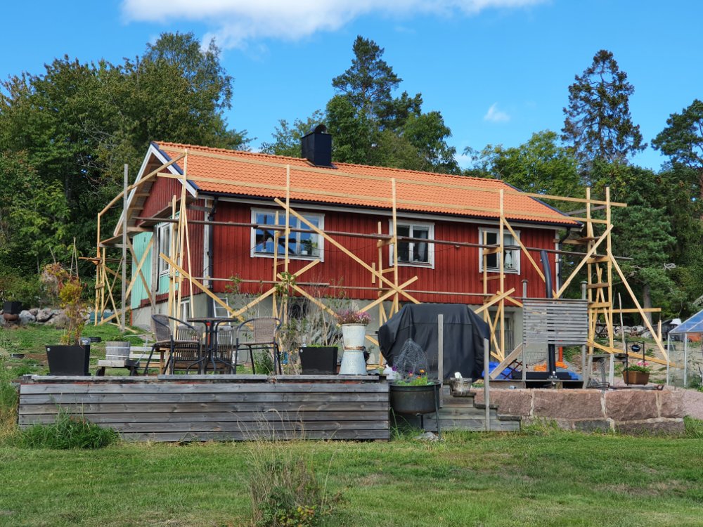 …klart, med tillfälliga stuprör, eller rättare sagt de gamla är kvar, tills de byter fasaden o sätter dit de nya. 👍😊 Känns litet ovant med svart skorsten, men vi vänjer oss säkert 😜 Nu är det paus ca 1,5 vecka, innan de kommer igen. Nån gång nästa vecka kommer de o gräver plinthål till farstukvisten, det missade vi när de var här i våras… Tur att de kunde komma igen, de hade ett annat litet jobb härute… Flyt. 🤗👍