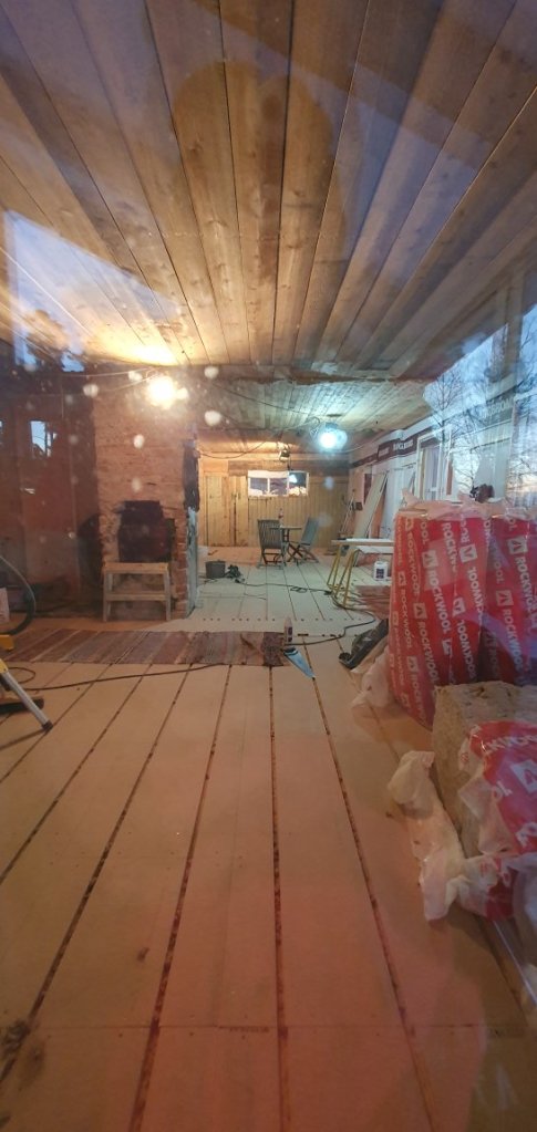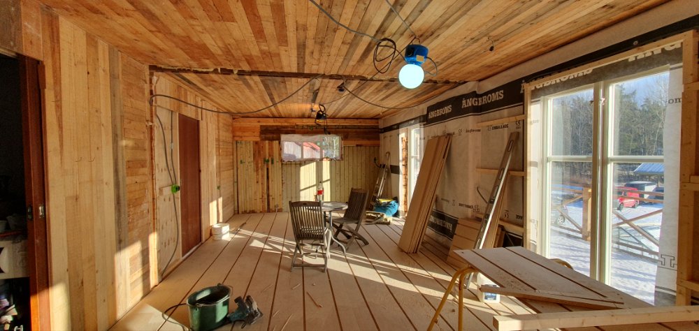 …håller de på med nu, så det märks inte så mycket. Golvspånet är iaf på plats, så kanske kan rörisen komma snart o lägga slang för golvvärmen… 🤗 Härligt ljus har vi iaf….iaf just nu. Till sommarn blir det säkert mer av ett problem, för värmen skull, men en sak i taget. 😁