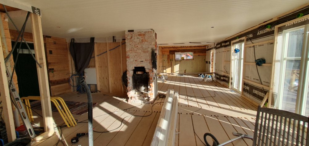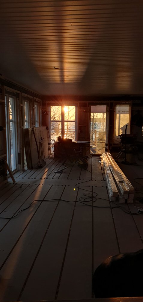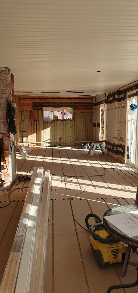 …golvspånet på plats, redo för röris, elektrikern verkar ha dragit klart det mesta av elen, pärlsponten i taket nästan helt klar.🤗🤗🤗😍👍