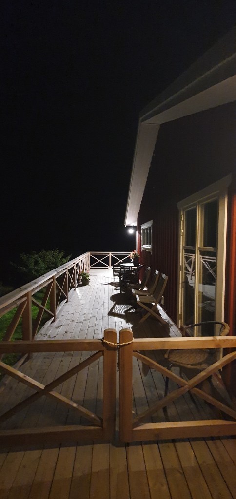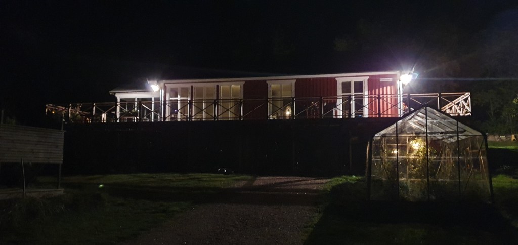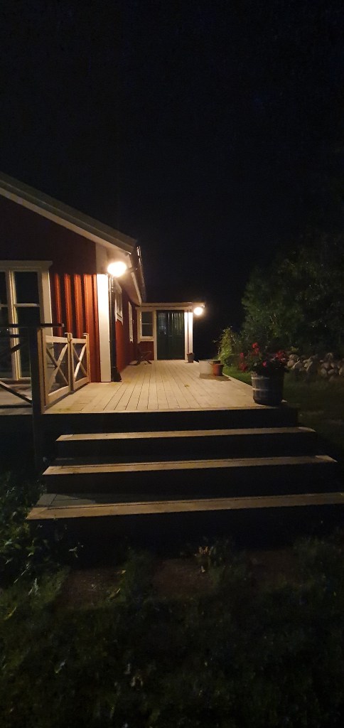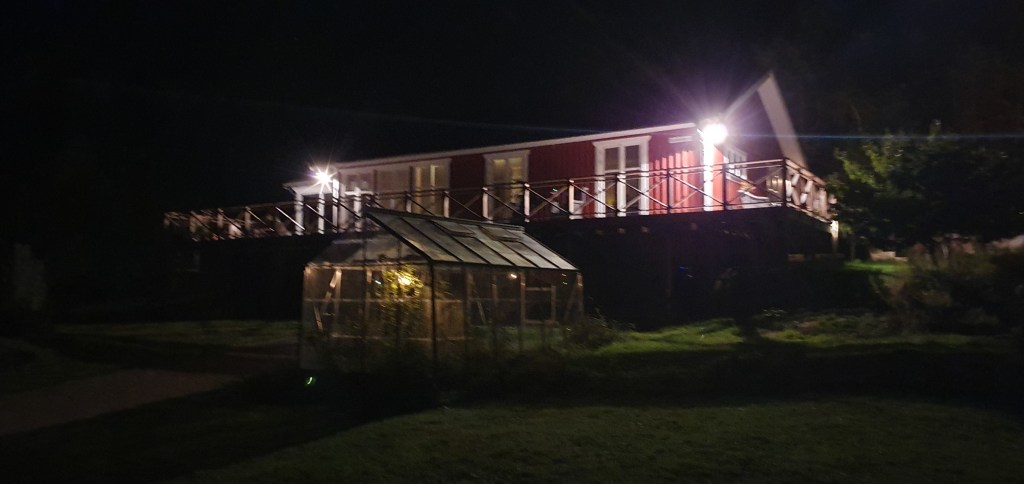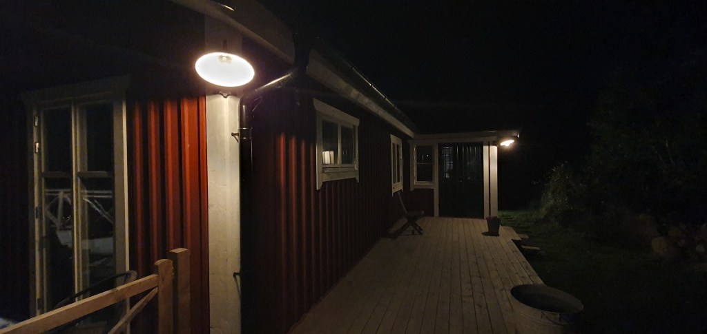 …får prova oss fram med ljusstyrka osv så att det blir bra. På baksidan vid entrén är det litet svagare lampor, och sen två olika starka framåt, då får man litet bättre sikt när man kommer med bilen o ska packa ur o så… Vi får se hur det blir bäst.. man vill ju inte bli bländad heller… 🤔🥴😁