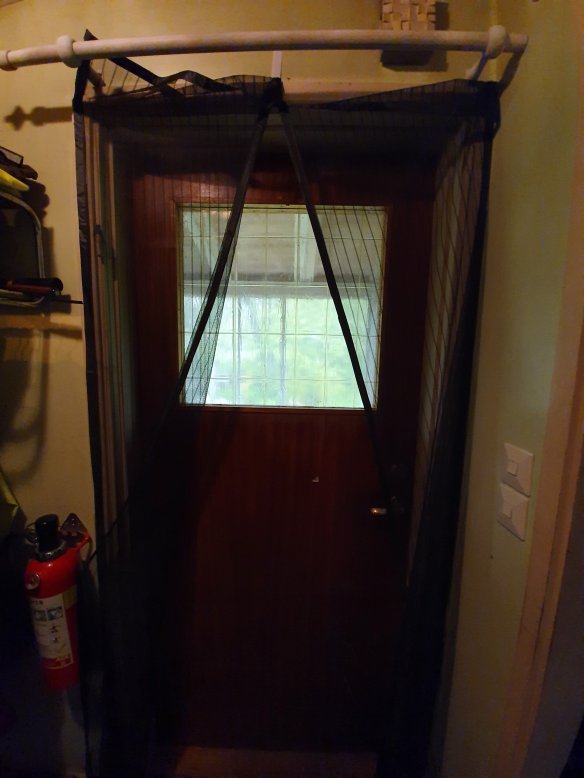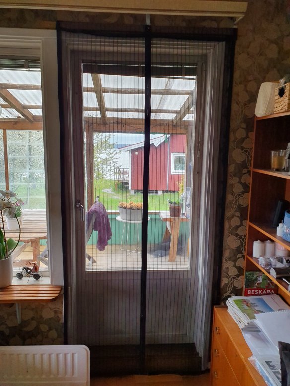 Försöker få ordning på nya myggnäten i dörrarna, Gittan förstörde ju de andra förra sommaren, jätteroliga att hänga i.. ??