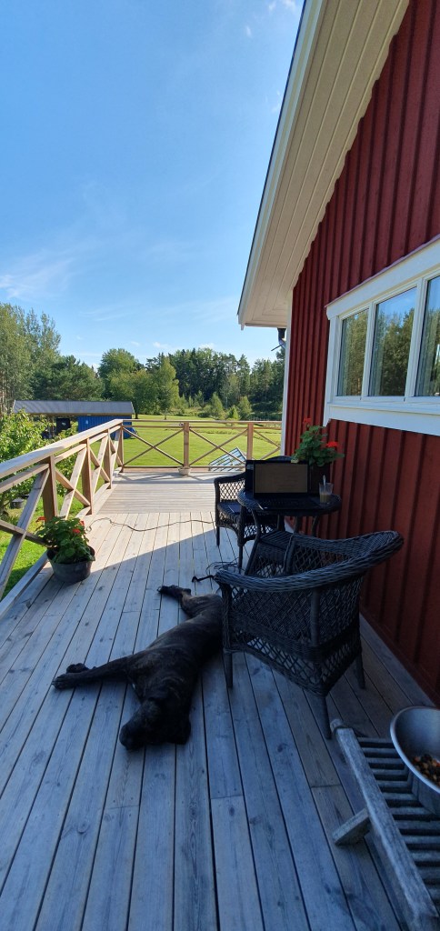 Bettan fick somna in igår. 🖤❤️🩹 R o Gittan sover fortfarande, vi är helt slut alla tre. 🥺😢 Sitter ensam på altanen i morgonsolen, i vanliga fall så hade ju Bettan varit här med mig… Hon älskade lugnet på morronen, altanen o solen. 💞 Tänk att en hund kan göra sånt avtryck. 💞