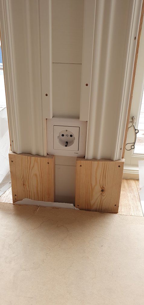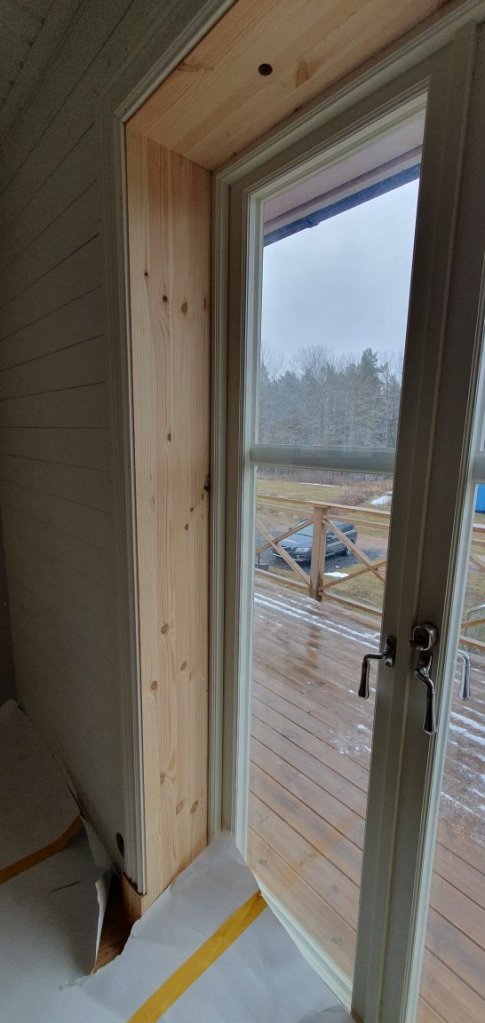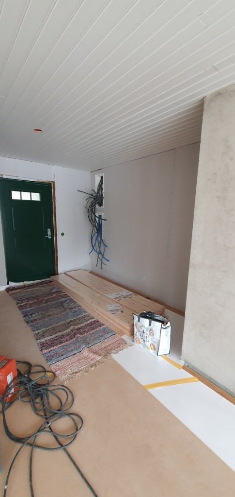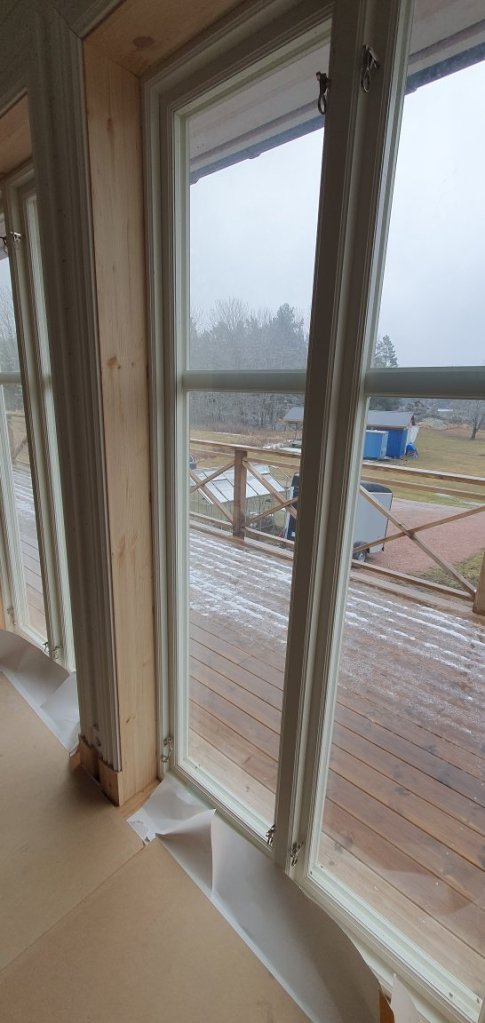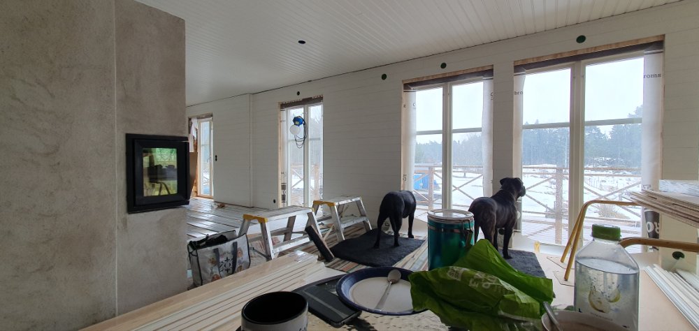 ….ute 🥴 men inne har vi det ganska bra. 😍🤗👍 Golvet lagt, nästan alla salningar klara, å skurklossarna på plats. 🥰 Taklisterna likaså. Köket skulle kommit i onsdags, men chauffören bangade…. hoppas han vågar köra ända fram kommande onsdag. 😳🤪