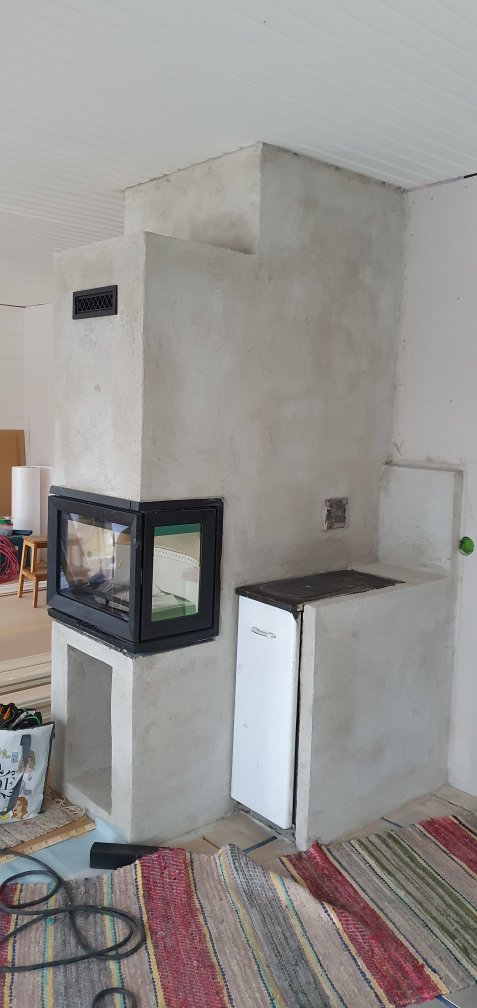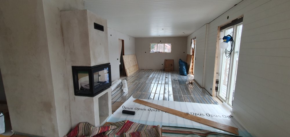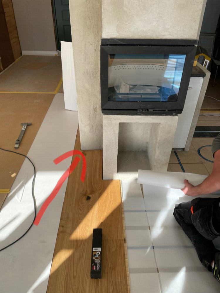 …peek, snickarna lägger golvet. Ser ut som att de redan lagt hall o vardagsrum… men man kan inte vara säker. 🤪 Röda pilen är där golv/gnistskyddet ska börja men vi vet inte hur långt utanför Smalspisen, till höger, det måste gå. Förhoppningsvis max till dörröppningen.. 🤔😍 Vi får fundera o kika i helgen, o förhoppningsvis svarar sotaren på mitt mail med frågan, snart. Spännande att komma ut o se i helgen. 🤗🥰