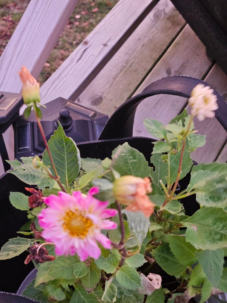 Dahliorna blommar fortfarande, men får ta in dem nu då det ev kommer snö till veckan… 😱